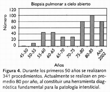 Ante el control de la tuberculosis, pero especialmente por el convencimiento de la bondad de su tratamiento médico, se desplazaba la cirugía necesaria para la tuberculosis por procedimientos de diagnóstico como la biopsia de pulmón a cielo abierto. Como puede observarse en la Figura 4, se empezó a utilizar a partir de 1950; hasta el año de 1985 se realizaron 2,341. Sin embargo, actualmente se realizan un promedio de 80 procedimientos por año ya que constituye el estándar de oro en el diagnóstico de la patología intersticial y fundamental en la investigación respectiva, lo que ubica al INER como líder universal en este campo (Figura 4). Es de particular interés observar la evolución de éste y otros procedimientos a lo largo del tiempo.