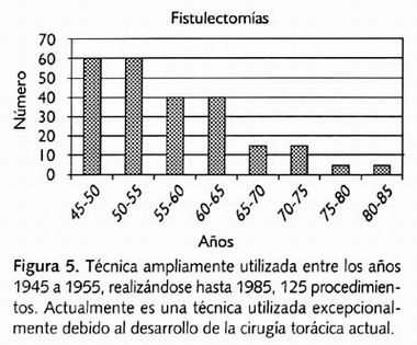 Una de las complicaciones más frecuentes y temidas, una vez dominada la técnica de refección pulmonar, era la fístula broncopleural, por lo cual se desarrolla una técnica de tratamiento. La fistulectomía se utilizó ampliamente durante los años 1945 a 1955, también como una cirugía para el tratamiento contra la tuberculosis. Con el desarrollo de mejores técnicas quirúrgicas, fue disminuyendo su utilización desapareciendo prácticamente hacia el año 1985 (Figura 5).