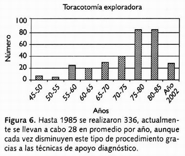 Es muy interesante ver cómo el desarrollo de la cirugía ha cambiado el tipo y número de procedimientos realizados. La toracotomía exploradora, por ejemplo, durante los inicios en la década de los cuarenta y cincuenta se realizaba con poca frecuencia (Figura 6), pero en 1985 su incidencia fue en aumento, debido quizá al aún poco desarrollo de las técnicas alternas de diagnóstico. El paciente tenía que ser sometido finalmente a una cirugía diagnóstica y posiblemente terapéutico simultánea. Actualmente, con el gran arsenal de técnicas diagnósticas, el número de toracotomías exploradoras ha disminuido progresivamente en los últimos cinco años con un promedio de 28 por año, y en el último año, no se realizó un procedimiento de este tipo.