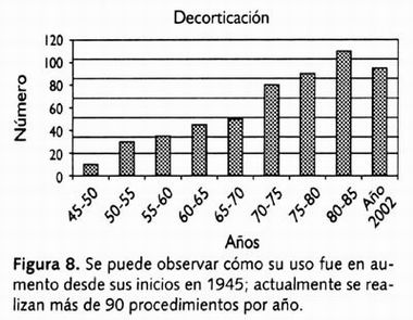 En cuanto a las neumonectomías fueron muy utilizadas entre 1955 y 1970. El cambio en los conceptos de enfermedades como el cáncer pulmonar y otras patologías, así como las novedosas técnicas quirúrgicas, han permitido disminuir el número de esta cirugía "mutilante" fisiológicamente, en cierto sentido. Hacia 1985, su número había disminuido (Figura 7). En la actualidad se efectúan en el Instituto 18 neumonectomías por año; la decorticación es hoy por hoy la cirugía más frecuente en cuanto a la patología infecciosa pulmonar y su desarrollo ha sido interesante ya que en los inicios de la cirugía torácica se realizaba con poca frecuencia debido al desconocimiento de las técnicas actuales y a la dificultad de la ventilación transoperatoria. Actualmente se han efectuado más de 90 cirugías por año durante los últimos cinco años, con resultados exitosos en la mejoría de la función ventilatoria del paciente (Figura 8).