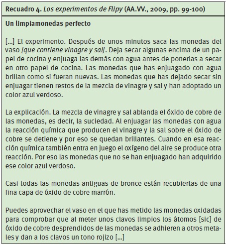 Tipo 4. Es un fragmento de libro de ciencia recreativa que recoge episodios emitidos en un popular programa de televisión. Obviamente el objetivo principal es la búsqueda de lo espectacular. El fragmento expone una actividad que consiste en limpiar monedas con vinagre. Se basa en una reacción del tipo: óxido metálico + ácido → sal + agua, pero en ningún momento aparece ésta, ni tampoco fórmula alguna. Se sortean las explicaciones y, cuando se hacen, no se rebasa un nivel superficial, empleando el lenguaje común (p.ej. en lugar de acetato sódico se dice "restos de la mezcla de vinagre y sal"). (Recuadro 4.)