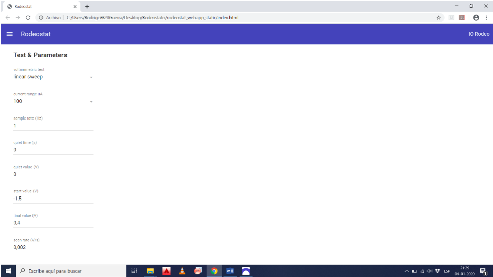 En la Figura 7 se puede apreciar que la sección “Connection Status” está en estado “false”, lo que significa que no existe conexión entre el equipo y el computador. Esta condición debe cambiar a “true” para indicar que el potenciostao y el computador están conectados y listos para la ejecución de cualquiera de los test. Al mismo tiempo es posible ver en la sección “Available Ports” el puerto en el cual está conectado el equipo, que en nuestro caso corresponde al COM3. Esta interfase se debe mantener abierta durante todo el tiempo que se esté utilizando el equipo. En la carpeta “rodeostat_webapp_static” se puede abrir la webapp. Esta webapp permite la administración de los tipos de test a ejecutar, rango de parámetros a utilizar en cada test y la adquisición de datos de cada test ejecutado. La Figura 8 muestra la pantalla de acceso a la webapp al hacer clic en el archivo “index” en la capeta “rodeostat_webapp_static” como lo muestra la Figura 9.