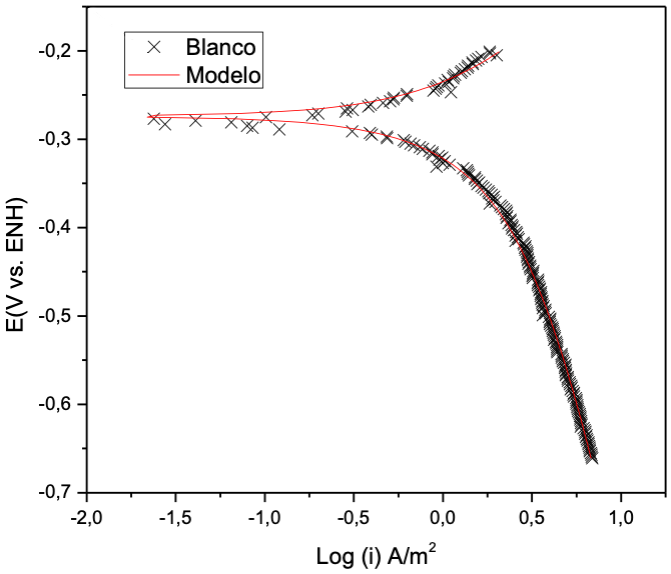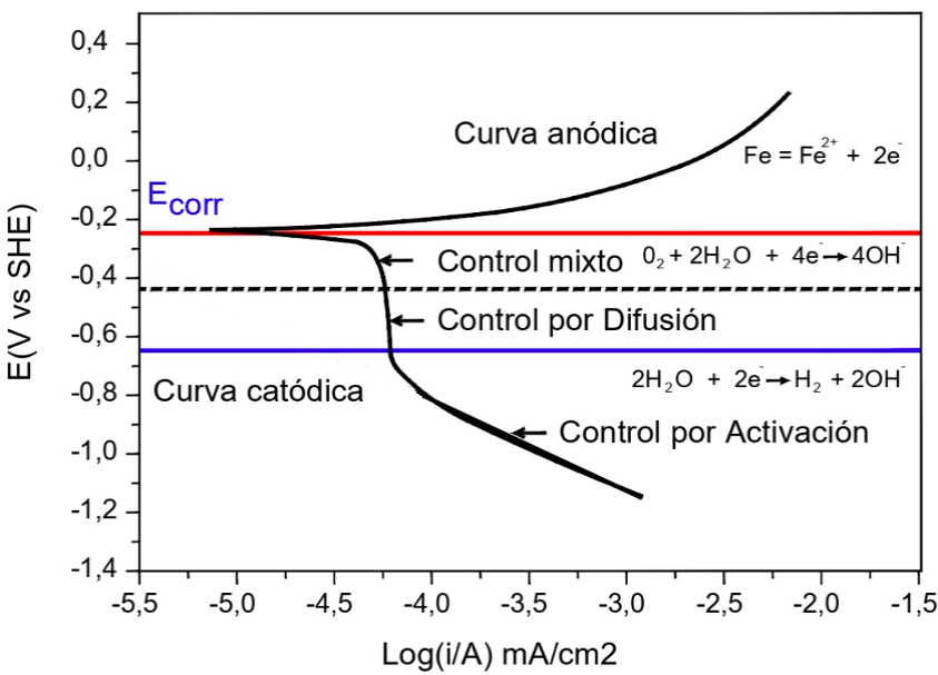 iL,O2 (A cm-2) es la densidad de corriente límite para la reducción del oxígeno, io,O2 (A cm-2) es la densidad de corriente de intercambio para el oxígeno, Eeq,O2 (V) es el potencial de equilibrio para la reducción del oxígeno, io,Fe, es la densidad de corriente de intercambio para el hierro, Eeq,Fe es el potencial de equilibrio para el hierro. La densidad de corriente de corrosión (icor) puede ser calculada de la ecuación 10, remplazando el potencial aplicado (E) por el potencial de corrosión (Ecor), obtenido directamente de la curva corriente-potencial experimental y los parámetros electroquímicos para la reacción catódica de la reducción del oxígeno y la oxidación del hierro, obtenidos previamente del ajuste de la ecuación 10 a los datos experimentales bajo la condición de corriente total cero (it = 0) ecuación 11.