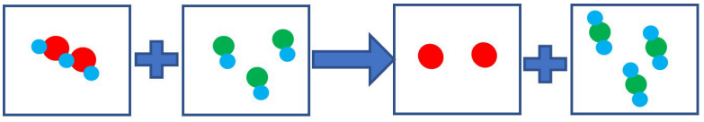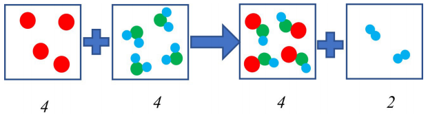 De esta manera la reacción cuya ecuación química es A + 2B2 → AB4, microscópicamente sería como la Figura 5.