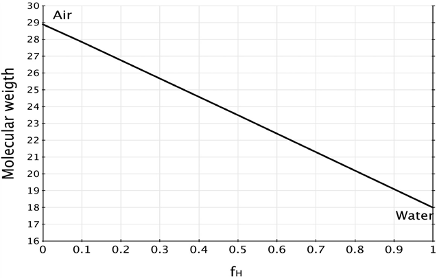 We define an air parcel as an air volume that has a specific pressure, temperature and fixed composition conditions. Using equation (4) it is possible to calculate and plot the values of Ma for dry air (f H =0) and for water vapor (f H =1) Figure 1 presents the possible Ma values. It is observed that when water vapor content increases, the air parcel molecular weight goes from the molecular weight of the dry air (Md = 29 g/mol) to the molecular weight of the water (Mw = 18 g/mol).