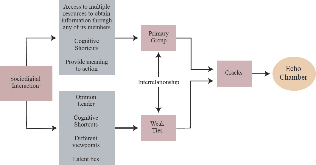 Finally, the strength of weak ties is reinforced in the framework of sociodigital interaction. In addition, it becomes a mechanism that influences electoral opinion and preferences by allowing access to other types of information. These ties are in latency, so they may become strong ties or they may be diluted. As a summary and taking into account the evidence obtained in this research, Figure 1 shows how the articulation of the primary group and the weak ties generate the cracks of the echo chamber from sociodigital interaction.