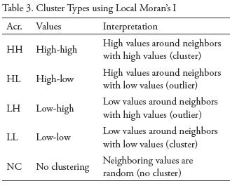 where Ii is the local Moran's I coefficient, X is the value of the variable of interest, wij is the matrix of spatial weights, and n is the number of observations. Through calculating zvalues of the local Moran statistic (see Anselin, 1995; Getis and Ord, 1996) it is then possible to identify two types of spatial clusters, two types of outliers and a noclustering category (Table 3):