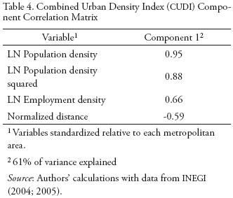 Table 4 shows the component matrix of the factor analysis. Only one factor with an eigenvalue greater than 1 was extracted. This suggests that city structures in the region are not very complex, at least in the way these variables correlate. As would be expected, employment and population densities decrease with distance from city centers.