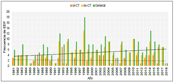 Figure 4 Annual variation of extreme precipitation events (EPEs) in the State of Colima over the 1981-2018 period. The lines show the trends of non-CT (continuous line) and CT (dotted line) EPEs over the study period.