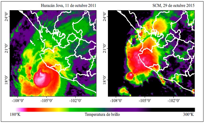 Figure 8 GOES-13 satellite products (Knapp and Wilkins, 2018) for Hurricane Jova and a Mesoscale Convective System.