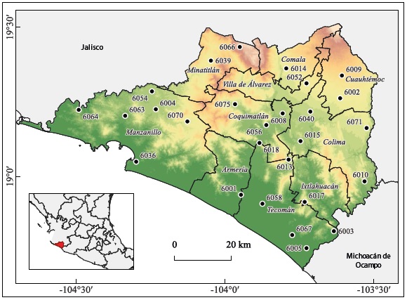 The state of Colima is located on the western coast of Mexico, between 18o41’ and 19o31’ N and 103o29’ and 104o41’ W (Figure 1). With a total extent of about 5 600 km2, it shares borders with the states of Michoacán de Ocampo and Jalisco and faces the Pacific Ocean along a 150-km long coastline. It has a steep slope that rises from the ocean to 3 800 meters above sea level on the southern slopes of the Colima volcano. The prevailing climate (86% coverage) is warm subhumid, but dry and semi-dry (12.5%) and temperate subhumid (1.5%) climates also occur; mean annual temperature is 25 oC with a summer rainy season (INEGI, 2021). Three distinct subregions are recognized: the northern (Comala and Cuauhtémoc), central (Minatitlán, Villa de Álvarez, Coquimatlán, Colima, and Ixtlahuacán), and southern (Manzanillo, Armería, and Tecomán) zones. According to the latest National Population and Housing Census, some 731,391 people inhabit the State in 226,853 households.