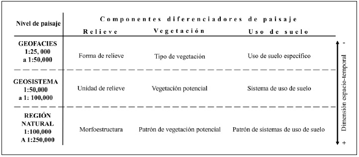 Para facilitar el entendimiento multiescalar de las relaciones espaciales entre los componentes del paisaje y de la realidad paisajística del sitio en estudio, se propuso una clasificación de carácter taxonómico-corológico, con tres niveles: región natural, geosistema y geofacies. En la región natural los componentes diferenciadores del paisaje adoptan la resolución espacio-temporal más gruesa: morfoestructura (relieve), patrón de vegetación potencial (vegetación) y patrón de sistemas de uso de suelo (uso de suelo); en el geosistema adoptan una resolución intermedia: unidad de relieve, vegetación potencial y sistema de uso de suelo, y en las geofacies adoptan la resolución más fina: forma de relieve, tipo de vegetación y uso de suelo específico.