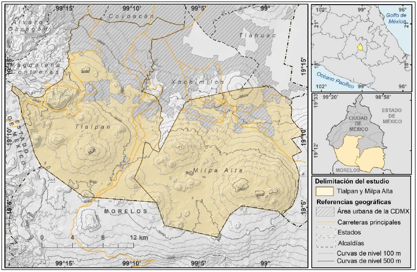 El área de estudio comprende las alcaldías de Tlalpan y Milpa Alta (19°04´ - 19°19´ latitud norte y 98° 57´ - 99°19´ longitud oeste) al sur de la Ciudad de México (Figura 2). Ambas entidades suman una superficie de 613 km2, y forman parte de la Provincia del Eje Neovolcánico y la Subprovincia Lagos y Volcanes Anáhuac (Mooser, 1996; Lugo, 1984; Bloomfield 1975). La gran variedad de relieves volcánicos y altos gradientes bioclimáticos se corresponden con una amplia diversidad ambiental y paisajística, que se incrementa al considerar que el área ha sido profusamente transformada a lo largo de la historia de los usos de suelo. En la actualidad, las presiones y dinámicas de ocupación y usos del suelo comprometen el potencial del área como proveedora de recursos hídricos fundamentales para el funcionamiento del sistema urbano de la CDMX (Ruíz-Gómez, 2006; SEDEMA, 2016), así como de una amplia riqueza forestal y características naturales únicas, con importantes reservas de flora y fauna de alto valor paisajístico. Sin embargo, no se reporta en la literatura reciente la existencia de cartografías que expresen la diversidad de ambientes de distinto potencial y limitantes al desarrollo.