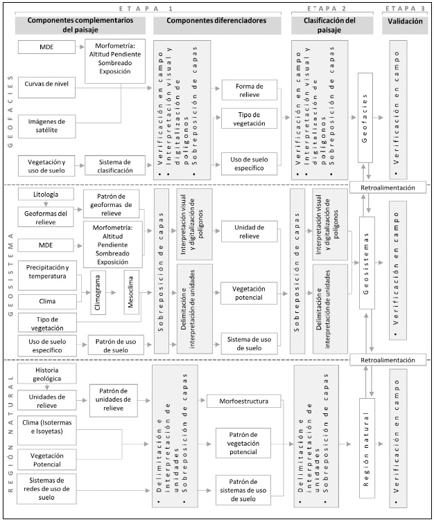 El procedimiento metodológico se divide en tres etapas secuenciales que se repiten para cada nivel de paisaje (Figura 3).