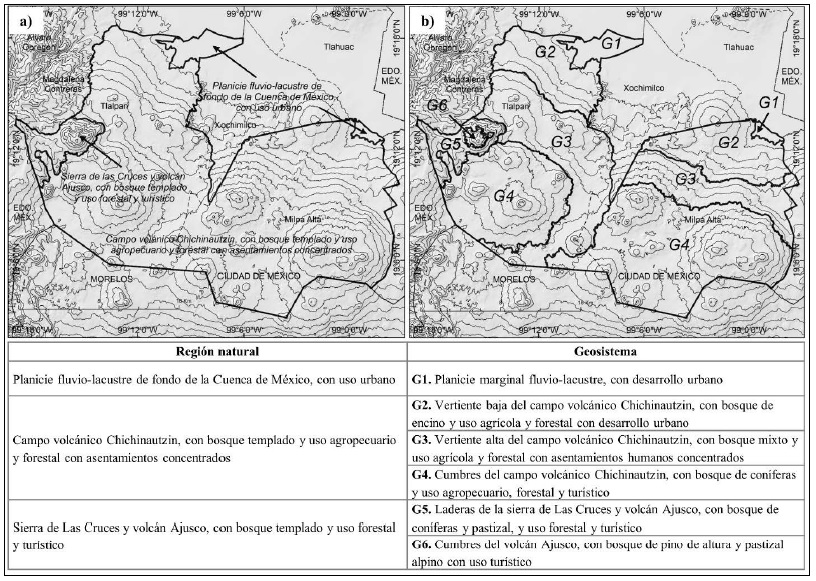 Figura 4 Organización del paisaje en Regiones naturales (a) y Geosistemas (b); alcaldías Tlalpan y Milpa Alta, Ciudad de México.