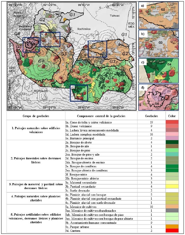 El mapa de paisajes de la Figura 5 muestra 113 tipos de geofacies distribuidos en los seis geosistemas que conforman a las alcaldías de Tlalpan y Milpa Alta. Si bien la geofacies es un nivel de resolución paisajística que integra tres componentes (forma de relieve, tipo de vegetación y uso de suelo), con la finalidad de facilitar la lectura del mapa, los 113 tipos de geofacies fueron integrados en cinco grupos y 28 clases en atención al componente diferenciador (forma de relieve, tipo de vegetación o uso de suelo específico) que considera el más representativo.