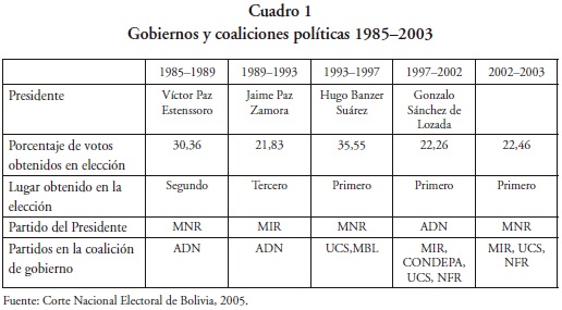 Los principales actores de la democracia pactada fueron el Movimiento Nacionalista Revolucionario (MNR), la Acción Democrática Nacionalista (ADN) y el Movimiento de Izquierda Revolucionaria (MIR), partidos que se alternaron el poder haciendo uso de distintas combinaciones en términos de alianza, como lo muestra el siguiente cuadro.
