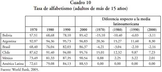 Estos cuadros muestran que en las décadas de 1960 y 1970 la esperanza de vida y la tasa de alfabetismo en Bolivia estaban muy lejos de la media latinoamericana (podría decirse incluso que estas cifras son escandalosas), diferencia que paulatinamente ha ido disminuyendo (aunque ciertamente las cifras actuales están lejos de ser consideradas aceptables). Aunque los avances más notorios se realizaron en el periodo posterior al intervencionismo estatal, sería erróneo atribuirlos a las políticas neoliberales. No queda duda que esta evolución responde a un proceso de largo plazo, proceso que con seguridad se inició durante el capitalismo de Estado, sin embargo, también debe mencionarse que el neoliberalismo no rompió lo iniciado en décadas pasadas.