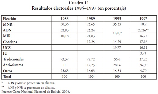 Los partidos anti-sistema comenzaron atacando estos patrones de comportamiento político, sin embargo, ante el descenso en la preferencia electoral de los partidos tradicionales, éstos, con ayuda de todo un despliegue mediático, recurrieron al pasado, al trauma de la ingobernabilidad, y señalando la amenaza a la estabilidad que implicaban los gobiernos débiles, no dejaron otro camino a Condepa y UCS (partidos que además carecían de bases ideológicas coherentes) que el de integrarse a la Democracia Pactada. Así, Condepa tuvo participación (aunque muy restringida) en el gobierno de Jaime Paz (del que se retiró en 1991) y fue parte de la coalición de gobierno liderada por ADN entre 1997 y 2002; mientras que UCS integró la coalición gobernante que encabezó el MNR entre 1993 y 1997 (ver Cuadro 1). NFR, a pesar de tener un desempeño un tanto distinto, también terminó insertándose en las coaliciones de gobierno, puesto que en 1997 estableció una alianza pre-electoral con ADN y posteriormente formó parte de su gobierno.