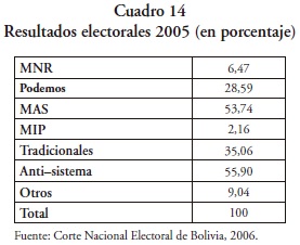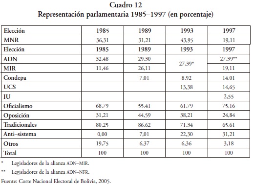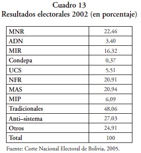 Los cuadros 11 y 13 muestran que entre 1985 y 2002 el número de partidos tradicionales se había incrementado pero su votación conjunta había disminuido, en tanto que nuevamente habían surgido partidos que con una retórica discursiva anti-sistémica conseguían un buen porcentaje de votos. El comportamiento de los partidos tradicionales ante este nuevo contexto era previsible: todos ellos se unieron en coalición para elegir y respaldar al gobierno del MNR encabezado por Gonzalo Sánchez de Lozada contra el peligro que representaba el MAS. NFR, que en principio no se sumó a la coalición gobernante, terminó ingresando en ella en 2003, confirmando que su comportamiento político era idéntico al de los partidos tradicionales. Así, sólo el MAS y el MIP quedaban fuera de la Democracia Pactada y Sánchez de Lozada gozaba de una mayoría congresal arrolladora que obligó a los dos partidos anti-sistema a abandonar su acción congresal y ejercer la oposición desde las calles.