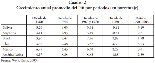 Los cuadros anteriores muestran que el crecimiento económico boliviano durante el periodo neoliberal (1990-2003) es mayor al de la región tomada en conjunto y superior al que experimentan Argentina, Brasil y México. Solamente Chile, la economía más dinámica de América Latina, presenta un crecimiento superior a Bolivia. Sin embargo, se demuestra que las políticas neoliberales bolivianas han causado un ritmo de crecimiento ligeramente menor (no demasiado significativo) que las políticas de intervención estatal de las décadas de 1960 y 1970 (en particular destaca el crecimiento obtenido en los años setenta). En el resto de los países, salvo Chile, y en la región en su conjunto se observa un crecimiento mayor y más significativo en las décadas de los sesenta y setenta que en el periodo neoliberal. El crecimiento de la economía chilena muestra un comportamiento contrario, ya que es bajo la aplicación de políticas neoliberales que adquiere mayor dinamismo.
