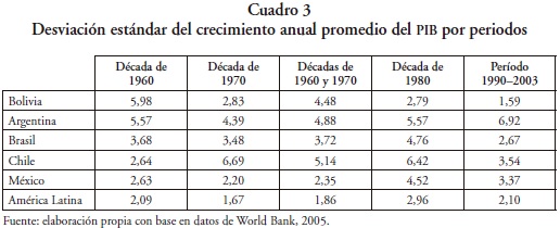 Estos resultados nos pueden ayudar a entender por qué en la escena política los críticos del neoliberalismo (en particular quienes se refieren a los casos argentino, brasileño y mexicano) añoran los tiempos pasados de intervención estatal. Sin embargo, analizando la estabilidad del crecimiento económico se puede concluir que el periodo neoliberal en Bolivia se caracteriza por un crecimiento mucho más estable que el periodo estatista, resultado lógico, puesto que durante los sesenta y los setenta la economía estaba muy afectada por la variación de los precios internacionales de materias primas, en particular, de minerales. El Cuadro 3 muestra que el crecimiento económico boliviano del periodo 1990-2003 es incluso el más estable respecto a los países considerados y a la región latinoamericana.