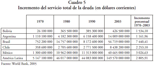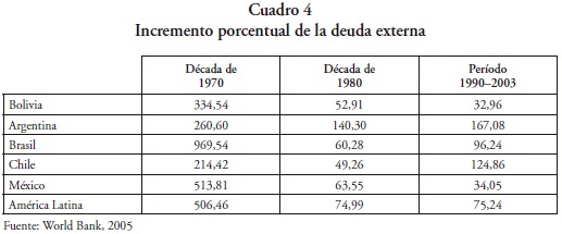 Durante la década de 1970 América Latina en general se endeudó. En este periodo todos los países aquí considerados incrementaron el monto de su deuda externa en más del doscientos por ciento, ritmo de endeudamiento que en décadas posteriores disminuye. Lo que resalta del cuadro anterior es que durante el periodo neoliberal Bolivia es el país que menores montos de deuda contrajo. Este análisis, sin embargo, debe ser complementado con datos que muestren el servicio de la deuda.