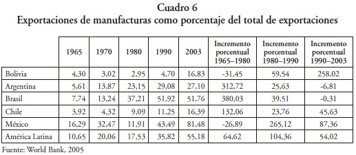 Este cuadro revela que la participación de manufacturas en el total de exportaciones de Bolivia se mantuvo prácticamente inalterada en todo el periodo anterior a la aplicación de las políticas neoliberales (incluyendo la década de 1980), lo cual prueba que en este país no existió la industrialización por sustitución de importaciones que, generalmente, se presume fue una estrategia de desarrollo en todos los países latinoamericanos. De forma contraria, los demás países considerados, y la región en su conjunto, sí tuvieron aumentos importantes en sus exportaciones de manufacturas antes del periodo neoliberal. Entre 1990 y 2003 las exportaciones de manufacturas recién empiezan a despegar ocasionando que Bolivia sea el país que muestre mayores incrementos al respecto, registrándose en el resto de los países un descenso en el ritmo de incremento de las manufacturas en las exportaciones. Sin embargo, debe hacerse notar que Bolivia aún se encuentra muy rezagada respecto a Argentina, Brasil y sobre todo México en cuanto a exportaciones manufactureras. Llama especial atención la baja participación de las manufacturas chilenas en el total de sus exportaciones, porcentaje que incluso es ligeramente inferior al que registra Bolivia.
