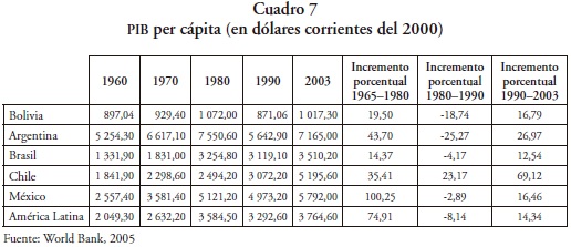 El análisis de la exportación de manufacturas es otro ejemplo de que el caso boliviano es muy distinto al argentino, al brasileño y al mexicano. Sin embargo, ello no significa que el neoliberalismo ha resuelto los problemas económicos y sociales en Bolivia, ya que éste es un país muy pobre, lo cual será evidente al comparar el PIB per cápita boliviano con el de los países aquí considerados.