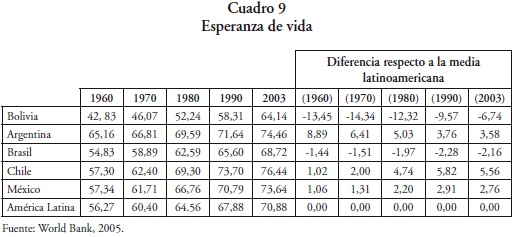 Estos datos señalan que, a pesar de que los niveles de desigualdad en América Latina en general son elevados, Bolivia es el menos desigual de los países aquí presentados. En particular, llama la atención la gran desigualdad existente en Brasil, Chile y México. Una vez más quedan claras las diferencias entre Bolivia y los demás países. Finalmente, analicemos el comportamiento de algunos indicadores sociales.