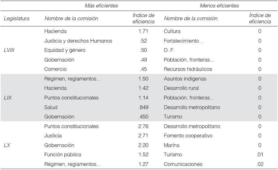 En contraste, las comisiones destacadas como las "menos eficientes" comparten al menos dos características. Por un lado, que su creación en principio responde al proceso de negociación puesto en marcha por los coordinadores de los grupos parlamentarios al inicio de cada legislatura en aras de cumplir con la proporcionalidad exigida por la ley. Esto, desde luego, sin descartar su interés en repartir de esta manera beneficios y prebendas a cambio de disciplina, o en canalizar la influencia de determinados actores sobre algún tipo de legislación. Por el otro, que los asuntos encomendados a sus miembros muestran un impacto focalizado y muchas veces coyuntural, lo que, dicho sea de paso, bien pudiera desalentar el interés de elevar la eficiencia de su comisión.