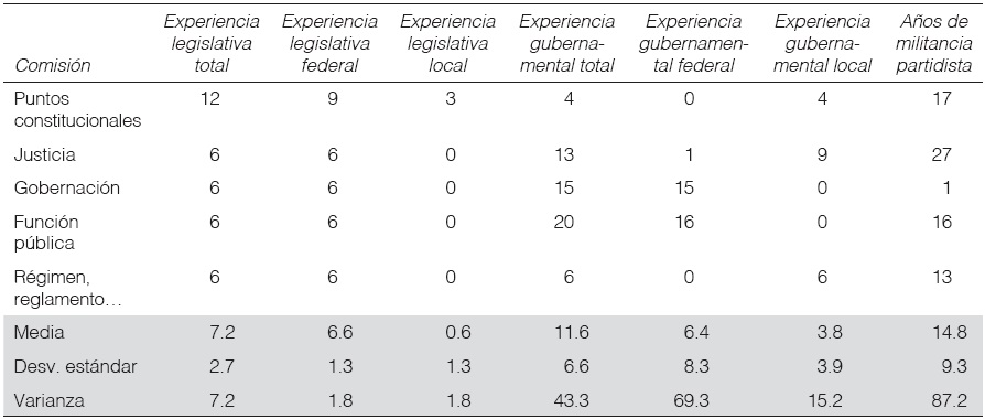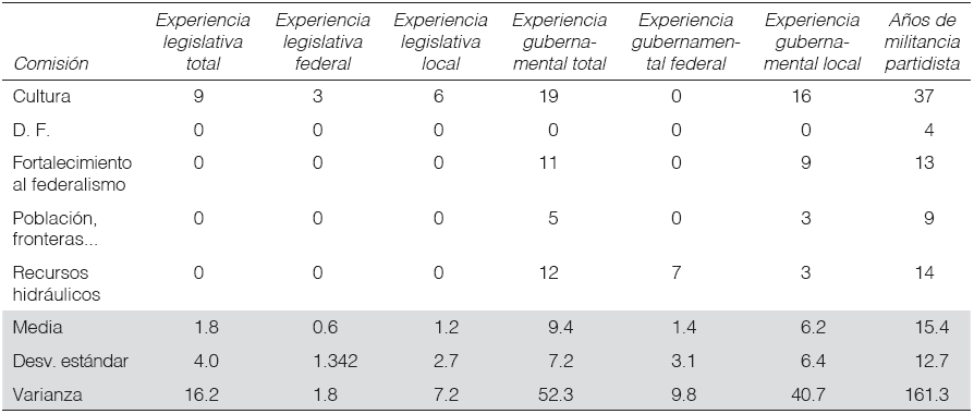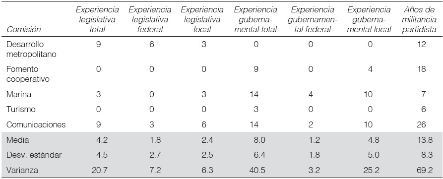 En lo correspondiente a la trayectoria político-profesional de los presidentes de las cinco comisiones "más eficientes" y las cinco "menos eficientes" de cada legislatura, se examinó su paso previo por cargos de representación popular o de la administración pública en el ámbito federal y estatal a fin de establecer su experiencia en lo relativo al procesamiento e implementación de la ley. Por último, se registraron sus años de militancia partidista como vía para establecer su capacidad negociadora (véanse los Anexos 4 y 5).
