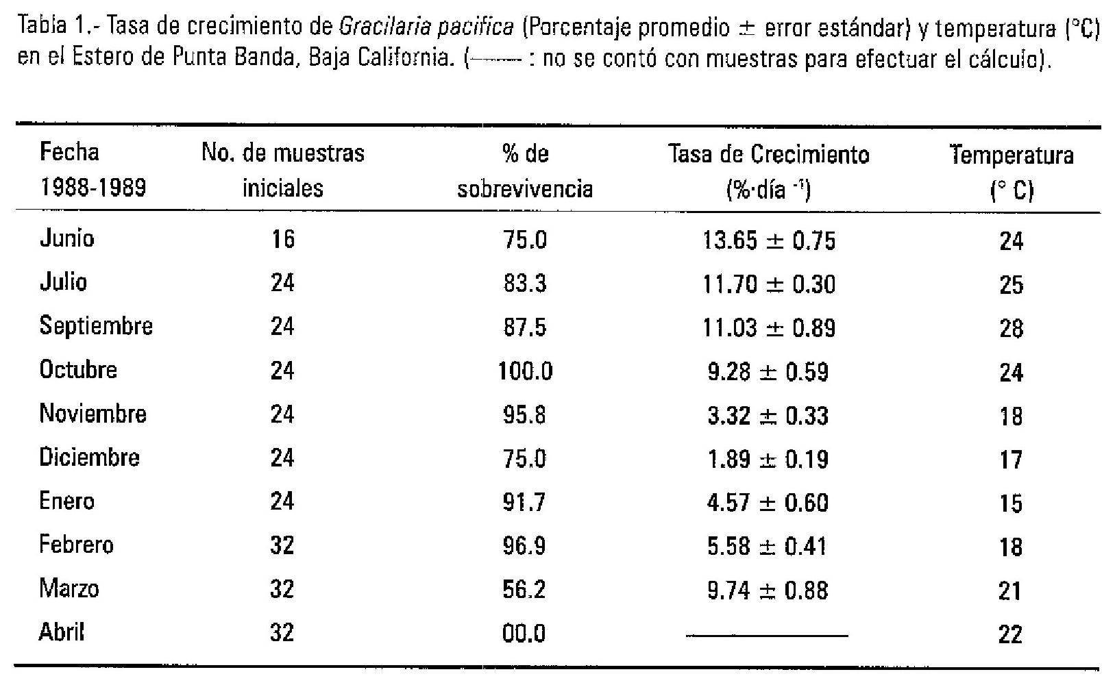 Los resultados obtenidos indican que las plantas de Gracilaria pacifica presentan un patrón de crecimiento estacional, con tasas de crecimiento máximos coincidiendo con valores altos de temperatura en verano y mínimas durante los meses de otoño-invierno (Tabla 1). Este mismo patrón estacional ha sido reportado para Gracilaria tikvahiae en New Hampshire, G. verrucosa de Filipinas e India, G. salicornia de Filipinas y Gracilaria sp. de la Laguna Madre, Tamaulipas, México (Largo et al., 1989; Oza et al., 1989; Penniman et al., 1986; Monreal-Guevara et al., 1994). Además, este comportamiento nos muestra que, para efectos de cultivo comercial, se tendrían mayores volúmenes de producción durante los meses de verano y menores en los meses de invierno.
