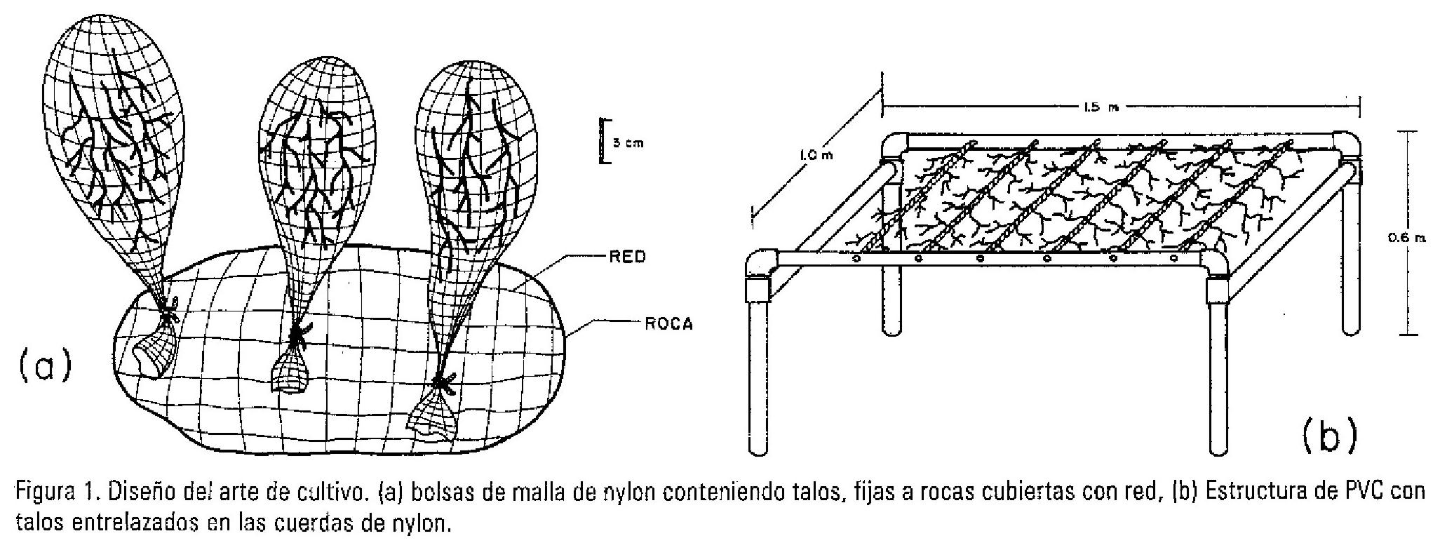 De octubre 1987 a febrero 1988 se probaron tres métodos, de acuerdo con las técnicas establecidas por Penniman (1983). El primer método consistió en colocar fragmentos 10 g de Gracilaria pacifica en bolsas de malla de "nylon" que se fijaron a rocas cubiertas con red como medio de anclaje en pozas del intermareal (Fig. 1a). Para el segundo método se utilizó una estructura de PVC de 1.0 × 1.5 m enterrada en el sedimento en un canal de marea en la cual se sujetaron fragmentos de 25 g de G. pacifica, insertados entre el trenzado de cuerdas de "nylon" (Fig. 1b). Para el tercer método se seleccionaron 35 plantas fijas a rocas y conchas, las cuales una vez que se pesaron junto con el sustrato, se ordenaron en líneas de cinco en cinco, dejándose de nuevo enterradas en la zona intermareal. Cabe señalar que estos tres métodos no mostraron resultados satisfactorios debido a la pérdida de un gran número de talos. Entre los problemas se observó que en el primer caso, la fragmentación y decaimiento de los talos posiblemente se debió a las condiciones adversas de salinidad y temperatura en que quedaron sumergidos los talos en las pozas y a la fricción dentro de la malla de "nylon". En el segundo método, los talos experimentaron una deshidratación excesiva al quedar 10 cm por arriba del suelo, expuestos al viento y a un calentamiento por el sol durante las mareas bajas. Además, se observó que material vegetal a la deriva (algas y hojas de Zostera marina Linnaeus y Spartina foliosa Trinius) quedaban atrapadas en la estructura y con ello propiciaban el desprendimiento de los talos de G. pacifica. En relación al tercer método, las plantas eran fácilmente removidas por las condiciones hidrodinámicas propias del lugar.