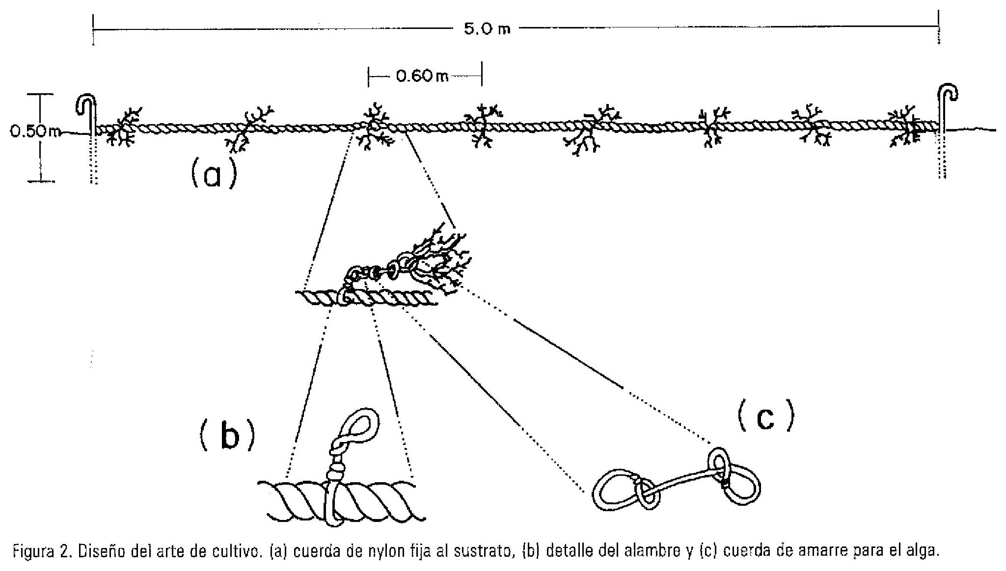 En virtud de que los tres métodos propuestos inicialmente presentaron problemas que no permitieron un adecuado manejo y mantenimiento de las plantas en el ambiente, se decidió implementar un cuarto método, de junio 1988 a abril 1989, el cual consistió en colocar cuerdas de polipropileno sobre la superficie plana del sustrato fango-arenoso en pozas someras de la zona intermareal y ancladas por los extremos mediante varillas metálicas en forma de bastón. A las cuerdas se sujetaron trozos de alambre recubiertos de plástico separados 60 cm y en éstos se fijaron fragmentos apicales de Gracilaria pacifica con un peso húmedo inicial de 6.0-6.5 g (8 por cuerda) por medio de un amarre de cuerda de "nylon" (Fig. 2). Los fragmentos utilizados se tomaron de plantas fijas de G. pacifica encontradas en el mismo sitio, lo que garantizó el suministro constante de material. Se permitió que cada mes los fragmentos crecieran por un lapso de 13-17 días y los encontrados al final de este período se limpiaron de organismos epífitos antes de volverse a pesar.