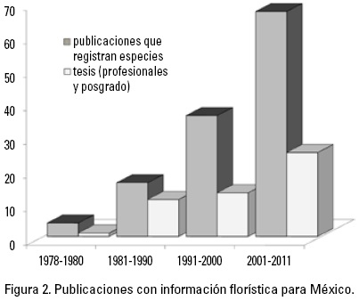 Otro índice del avance del conocimiento florístico en nuestro país es el número de trabajos publicados, que evidentemente es consecuente con el avance de los registros de las especies. Garduño Solórzano et al. (2003) y Novelo (2003) hicieron recuentos sobre la bibliografía ficológica de agua dulce, posteriores al trabajo de Ortega (1984); de acuerdo con esos recuentos, se reporta que en el curso de 34 años, 220 autores han publicado 123 artículos y 50 tesis con registros de especies, lo que promedia de 3 a 5 trabajos por año, según se consideren sólo artículos o artículos y tesis. Aunque la producción no es de ningún modo impactante, parece que la continuidad en los estudios es lo que ha soportado la tendencia que observamos en la Figura 2.