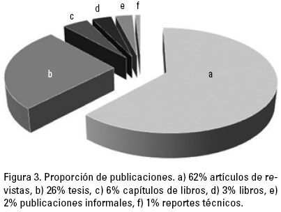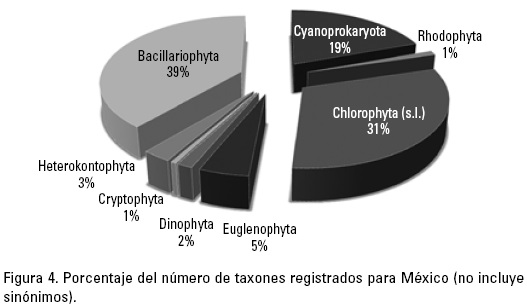 En los ambientes continentales mexicanos se han registrado 3,256 taxa, en 203 publicaciones dentro del periodo 1847-2011. Muchos de los registros previos a 1974 fueron incorporados por Ortega en su Catálogo de Algas Continentales Recientes (1984). Estimamos tener en nuestras bases una cobertura aproximada del 95% de las publicaciones formales, y aunque registramos 52 tesis de licenciatura y de posgrado, es evidente que no es el total. Las especies fueron publicadas en artículos de revistas, tesis, capítulos de libros, libros, publicaciones informales y reportes técnicos (Fig. 3). Los taxa registrados, eliminando los sinónimos, hacen un total de 2,974 y su proporción se muestra en la Figura 4.