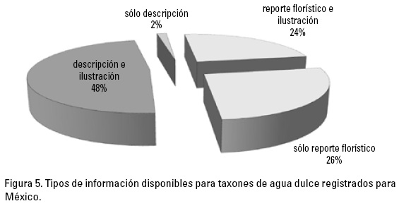 La información disponible para cada una de las especies es muy heterogénea, desde una simple mención hasta descripciones morfológicas completas, así como descripciones de su ciclo de vida y de sus condiciones ecológicas. Las ilustraciones tampoco son uniformes, ya que van desde esquemas desproporcionados hasta microfotografías y micrografías, pasando por dibujos cuidadosos y muy bien documentados. La información sobre los taxa registrados se muestra en la Figura 5, en la cual es posible notar que 26% de los registros no cuenta con descripciones.