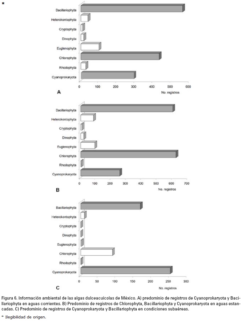 En cuanto a la información relativa a los tipos de hábitat en los que las algas se presentan, podemos decir lo siguiente: en aguas corrientes predominan los registros de Bacillariophyta, pero en aguas estancadas hay más registros de Chlorophyta. En los ambientes subaéreos se han registrado más Cyanoprokaryota (Fig. 6).