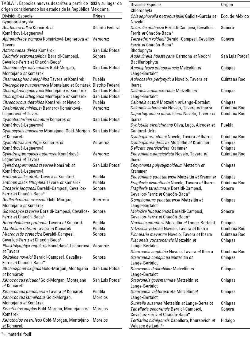 Pedroche y colaboradores (1993) reportaron que la contribución mexicana de especies de algas dulceacuícolas a la biodiversidad mundial (medida como descripciones originales) era muy modesta (apenas dos especies) para el periodo 1977-1993. Actualmente la situación es distinta, con un total de 65 especies nuevas descritas de 1993 a la fecha. Sin embargo, nuestra experiencia nos indica que el número de especies por describir puede ser mucho mayor a 3.6 por año y en el caso de las algas de agua dulce aún podemos pensar que existen en México géneros todavía no descritos (Tabla 1).