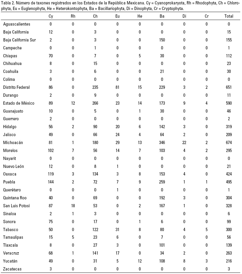 Las diferencias en la cantidad de registros son muy notables, dependiendo del estado de la República Mexicana del que provienen. Al comparar los datos de las publicaciones con los de la distribución de las especies, es notable la falta de registros en estados como Aguascalientes, Colima y Nayarit. Cinco estados cuentan con menos de 10 registros de especies. Siete tienen más de 10, pero menos de 99. Es decir que cerca del 50% de los estados del país no cuentan con información suficiente sobre la ficoflora que contienen; los 8 estados más grandes y norteños de la República sólo cuentan con 416 registros (14 % del total), mientras que los registros de San Luis Potosí o de Quintana Roo, provienen principalmente de la Huasteca o de la región de Yalahau respectivamente, es decir que en realidad no se conoce la flora de los estados, sino sólo la de una región particular de los mismos.