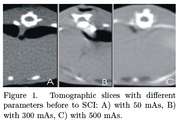 For the computerized axial tomography study an Elscint Tomograph model CT-TWIN was used. The main parameters were field of view (180 mm), current density (50-500mAs) and, potential (120 kV); with a 0.2 mm slice. In order to study the integration of the material in the spinal cord tissue, tomographic sessions were performed, one each week after the injury. To find the best possible operating parameters of the tomograph, different tests were performed. Figure 1 shows 3 runs with different operating parameters.