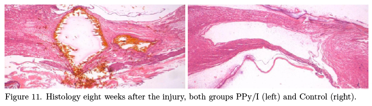 Figure 11 contains 2 images of the lesion zone after 8 weeks. In the PPy/I group, the implant has moved partially from the original site by the histological cuts, leaving voids of different size behind. This is due to the fragmentation of the tablet by the tissue growth. In the Control group, the cysts are much bigger than in the PPy/I group suggesting coalescence of cysts. The histological images show that the implant affects the evolution of the tissues after the lesion.