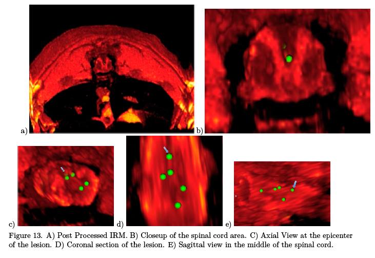 The MRI studies were processed with OSIRIX using a DICOM format. Figure 13 shows images extracted from a 3D reconstruction (The full video is available on demand from the authors). Figure 13 A) shows post processing 7T study, inches away from the epicenter of injury. Figure 13 B) close up of the spinal cord area, which shows the conserved cytoarchitecture, the H-shaped gray matter is clearly defined. The ROI (oval between the dorsal horns) is positioned on the cephalic side of the lesion. Figure 13 C) Axial section at the epicenter of the lesion, we observe the destruction of cytoarchitecture.