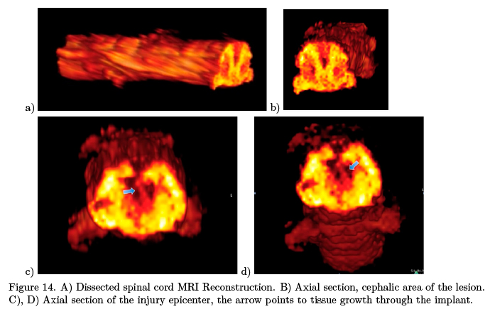 In the dissected spinal cord MRI, we obtained a resolution of 156 μm pp, Figure 14 A) shows the reconstruction of these MRI, with the center at the epicenter of injury. The axial section B) highlights the gray matter (hyperintense signal), the ventral root filaments at both ends at the base of the spinal cord (also hyperintense signal), we observe the meninges covering the spinal cord. In both, between the dorsal horns (center) and along the lateral horns, shows the extent of the lesion (hypointense signal) in the cephalic region. Selected view of the injury area shows a scattered gray and white matter; indicating that the morphology and cytoarchitecture of the spinal cord was destroyed, C) the implant and surrounding contrasting tissues suggest some preserved gray matter. D) Shows a waist in the spinal cord, characteristic of the lesion and the implant partially fused with the surrounding tissues. The resolution obtained allows us to observe tissue growth through the implant (arrow) in the lesion epicenter.