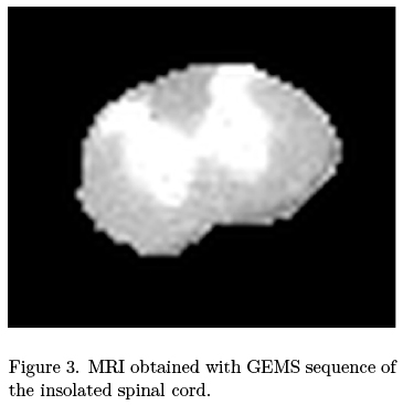 MRI studies were performed in a Varian 7T instrument, using standard gradient echo sequence with the following acquisition parameters: TE/TR = 4/15ms, FOV = 60 x 60mm, angle = 20°, matrix size = 256x256, NEX = 6. Figure 2 shows images obtained outside the area of injury, at the top center of the Figure 2 the intact cytoarchitecture of the nerve tissue can be observed, where the main feature is the "H" shape of the white matter, surrounded by the vertebral disc in black. Figure 2 shows a close up of this structure.