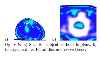 Figure 6 shows the color scale associated to the Hounsfield scale, to illustrate how it is possible to identify different tissues or materials as the implant. In the close-up, it is possible to observe the bone, spinal cord and implant material, the white zone is the bone (the dissected vertebral disc) and inside it the nerve tissue surrounds the implant material (almost square).