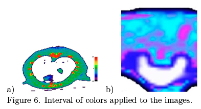 The segments of interest in the images were highlighted by applying a stain (false color) in the range of the Hounsfield scale enhancing the contrast between nerve tissues and bones. This effect can be seen in Figure 5, where the vertebral disc is in white and the spinal cord has two colors associated with the spinal cord tissue.
