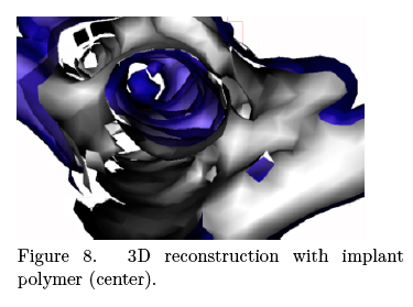 The tomographic images of the injured rats were reconstructed in 3D sequences with OSIRIX to follow the implant position, the laminectomy, the presence of cysts and the nerve tissue preservation. Figure 8 shows a recreation formed with 10 slices taken with a 180 mm field vision, current density of 300 mAs and a potential of 120 kV. The distance between each slice is 1 mm, the vertebral canal is showed and at the center the semi-square piece of implanted material can be observed.