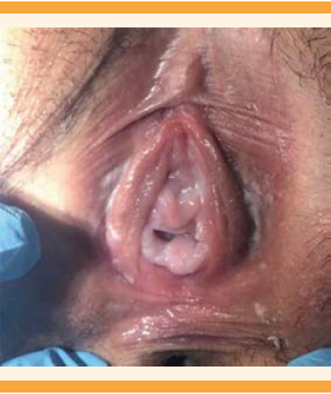 Paciente de 15 años, llevada a urgencias de Ginecología debido a la aparición súbita de dos lesiones ulcerosas en los labios menores, de 72 h de evolución. Antecedentes personales: relaciones sexuales con preservativo, nuligesta, eumenorreica, sin alguna enfermedad o intervención quirúrgica previa. El hallazgo de las lesiones en los genitales coincidió con un cuadro catarral con fiebre, tratado con paracetamol e ibuprofeno. En los genitales externos se advirtieron dos lesiones ulcerosas en los labios menores, con secreción blanquecina (Figura 1). La de mayor tamaño se encontraba en la región derecha de la horquilla posterior de los labios, no dolorosa a la presión y con diámetro aproximado de 2 cm, con una costra necrótica central. La de menor tamaño era blanquecina, de 1 cm, levemente dolorosa a la presión digital, ubicada en derredor del clítoris, hacia el lado izquierdo, con bordes eritematosos. En la exploración genital destacó la vagina eutrófica y el cuello uterino debidamente epitelizado, sin lesiones ulcerosas en algún otro sitio, solo destacaba el flujo maloliente. No se palpaban adenopatías inguinales, cervicales ni supraclaviculares; tampoco tuvo dolor a la palpación en esas regiones ni alguna úlcera extragenital.